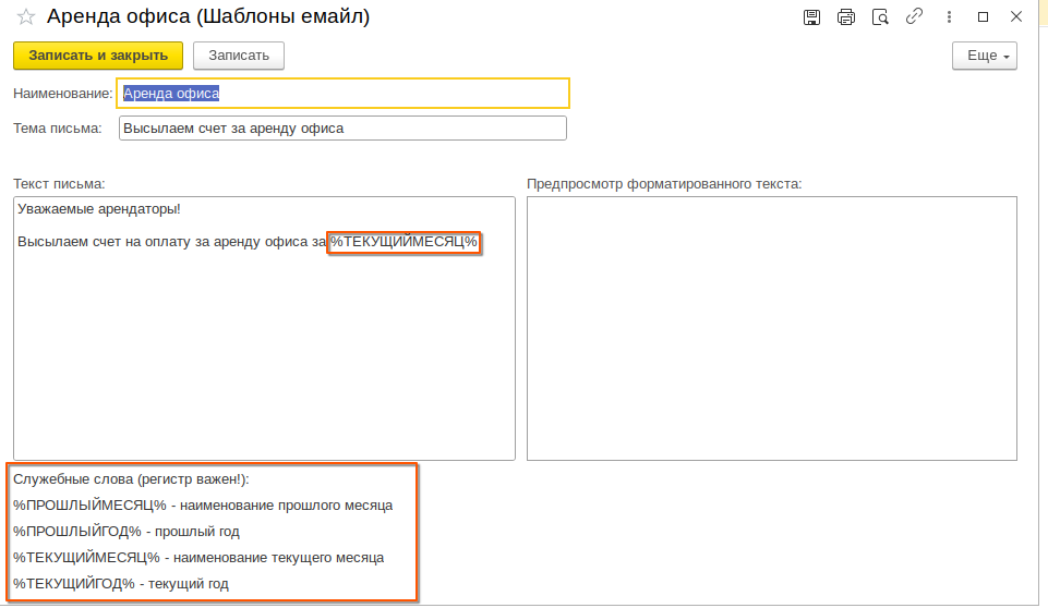 Когда письмо будет отправляться, то вместо этих фраз будут подставляться временные периоды. Например мы отправляем счет в январе 2026. Если текст письма будет:
